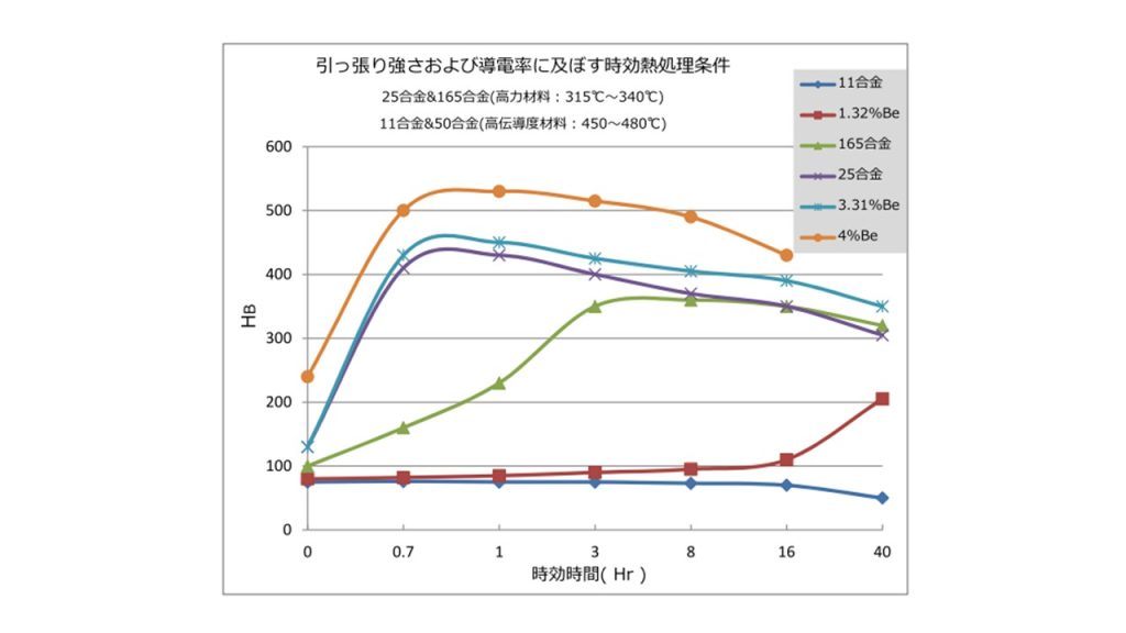 通常 300~350℃ 程度で数時間保持することで、ベリリウム化合物が微細に析出し、硬度・強度が大きく向上します。
